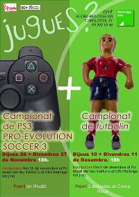 El proper Dijous 26 i el Divendres 27, a les 18h., es celebrarà un campionat de Play Station 3 al nostre centre. Les inscripcions es poden fer al mateix centre o al PIJ Mòbil dels instituts, fins el dia 25 (1EUR). El premi serà un Ipod