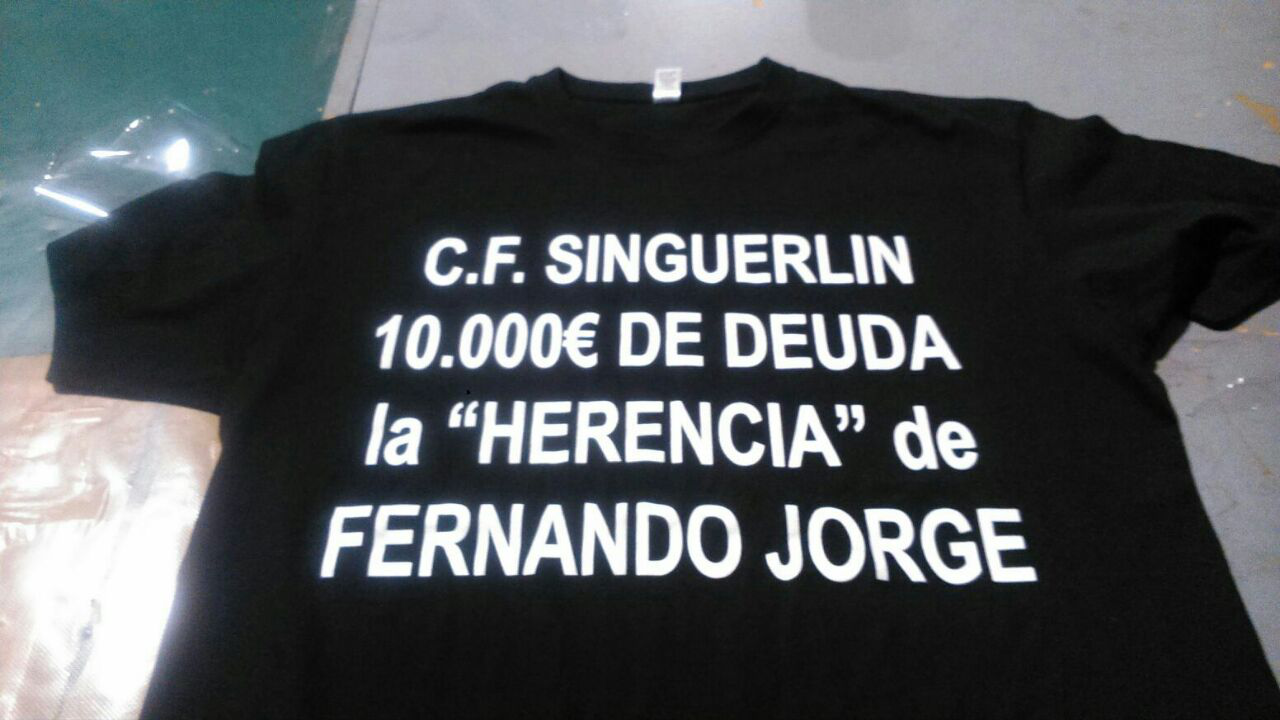 Antes del partido y en la foto oficial queda reflejado el mal ambiente que hay contra el anterior presidente y la junta gestora CF. SINGUERLIN con la protesta y manifestación por parte de la plantilla plasmada en camisetas negras con la frase: “CF. SINGUERLIN 10.000€ de deuda la HERENCIA de FERNANDO JORGE “, expresidente de la entidad verdiblanca que con una gestión tan desastrosa ha dejado al club en un estado calamitoso.